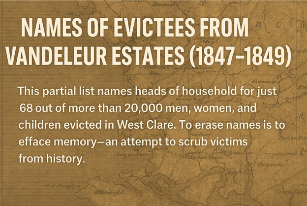 We know from contemporary reports that more than 20,000 people were evicted by the Vandeleurs in just this period alone – but we only have the names of 68 evicted, the heads of households of a total of 404 people; the other 336 counted merely as numbers of males and females. Thousands upon thousands more vanished from the record entirely. Their lives and identities—lost to hunger, displacement, death, and deliberate silence.